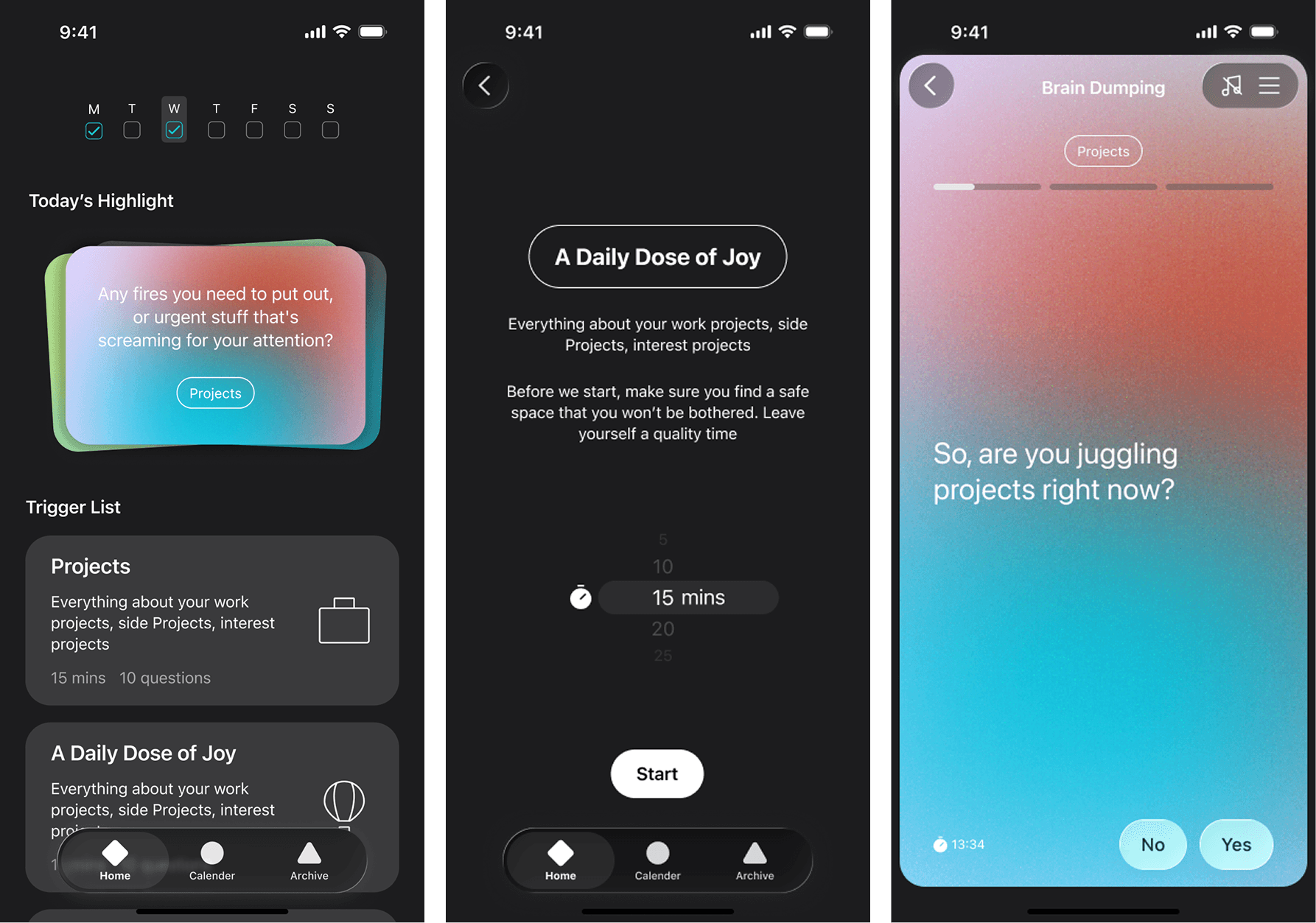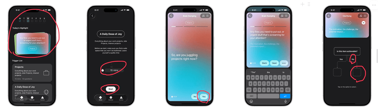 At the same time, the first design draft was ready. It included the main functions: Home, Brain Dump, Clarify, and Trigger Lists.