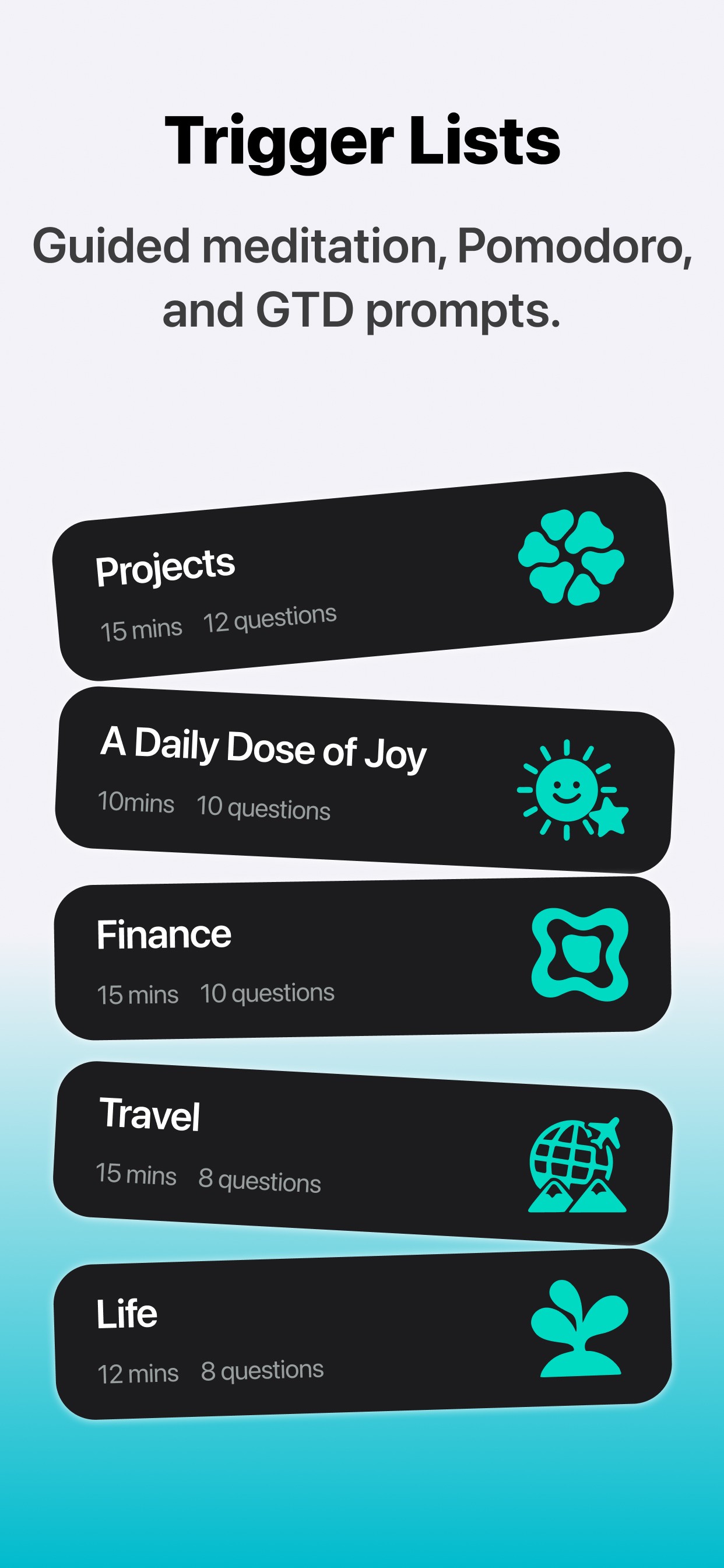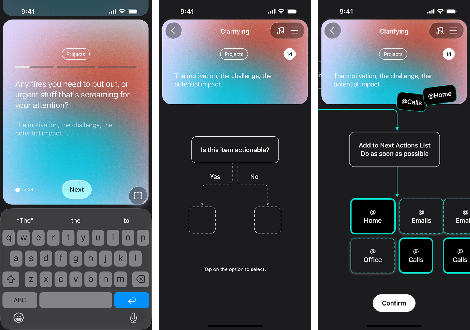 Users would start by picking a trigger list that interested them. The session would begin with a series of prompts to brain dump their thoughts, then move straight into Clarify to identify the next action.